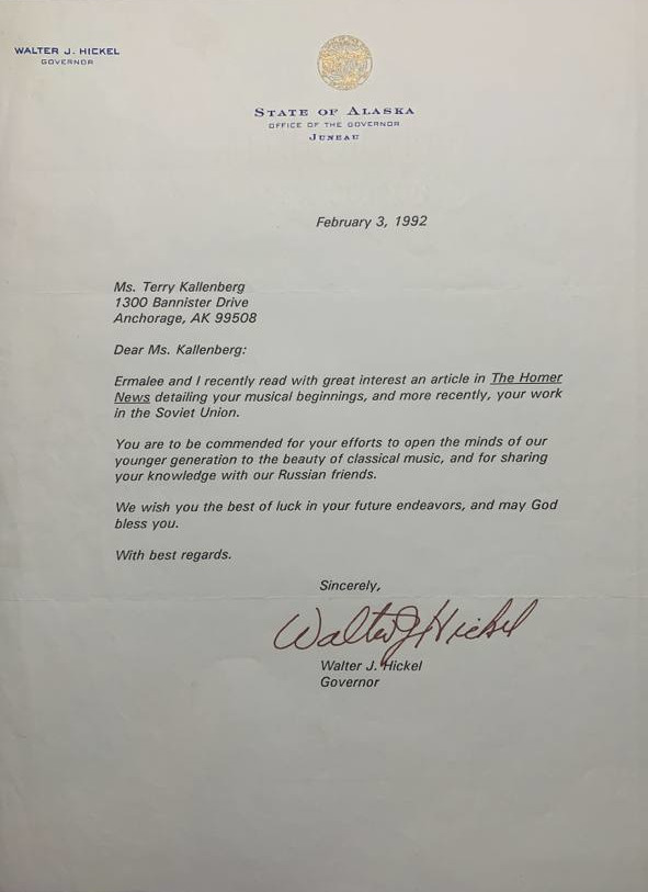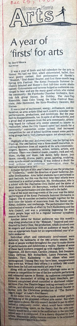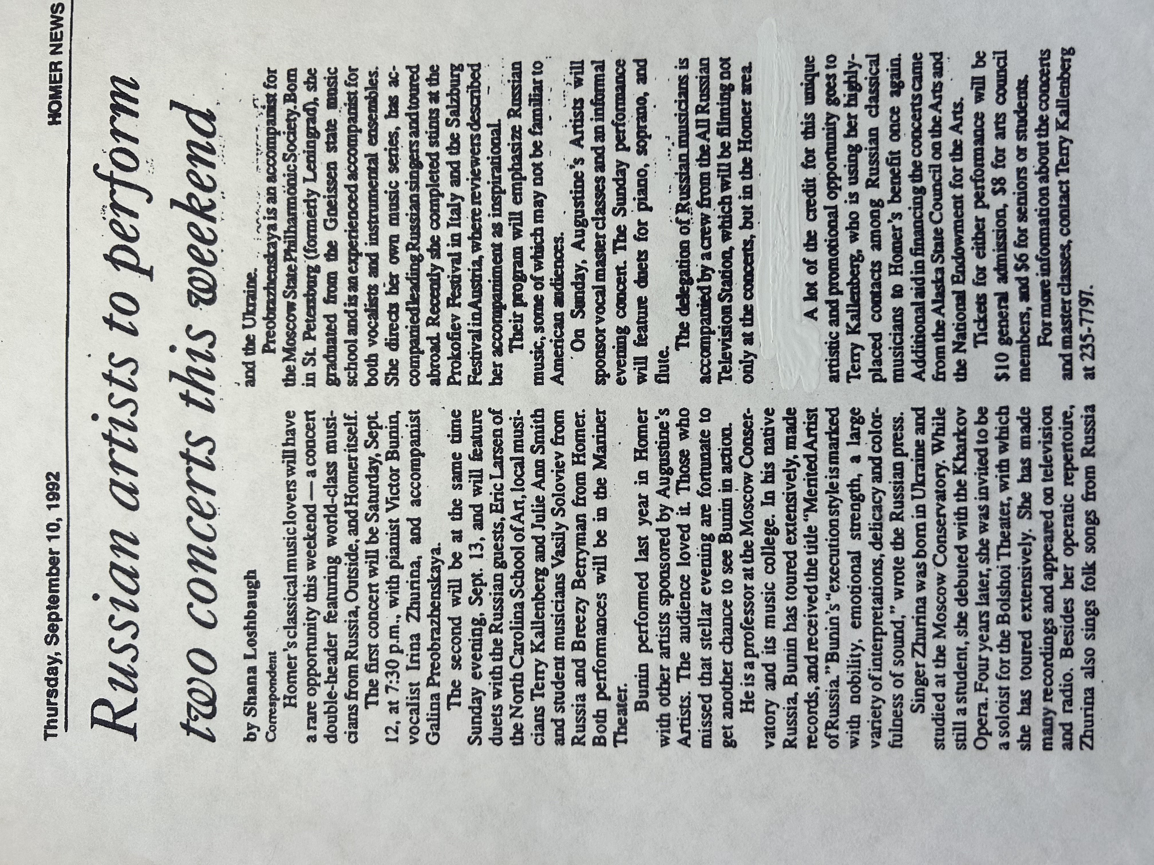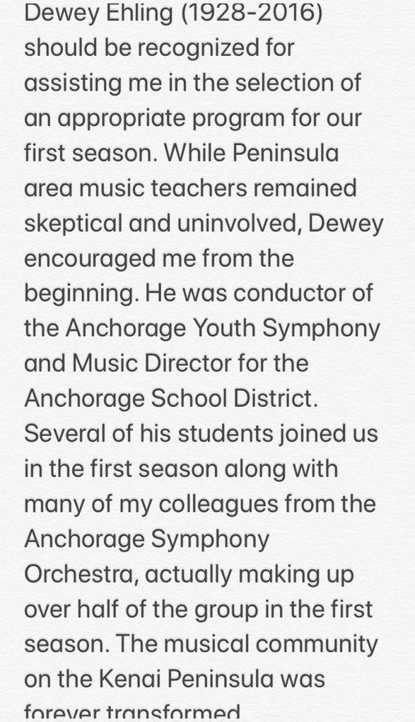 "Her strong, positive commitment to the arts has been demonstrated by the fact that she is founder and music director of Augustine's Artists and the Kenai Peninsula Orchestra." - Alan Schmitz, Ph.D. Coordinator of Music Programs